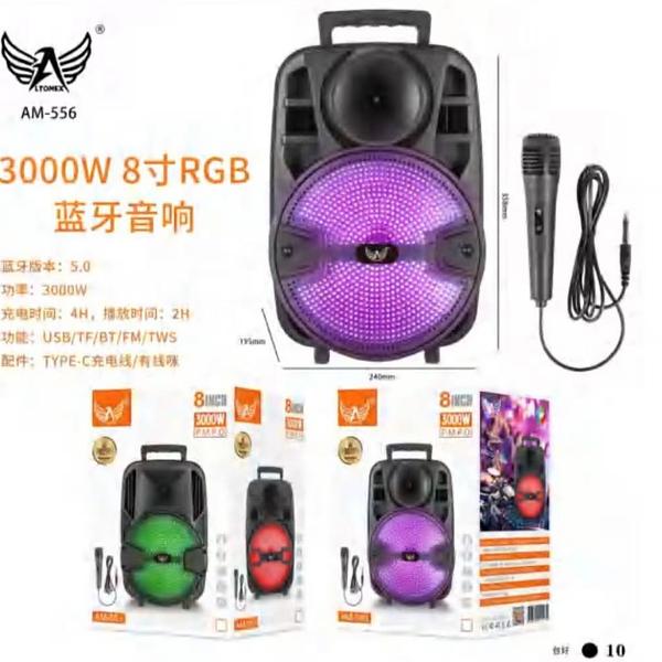 Caixa de som . Possui microfone RGB Potência: 3000W Tempo de reprodução: 2 horas AM556