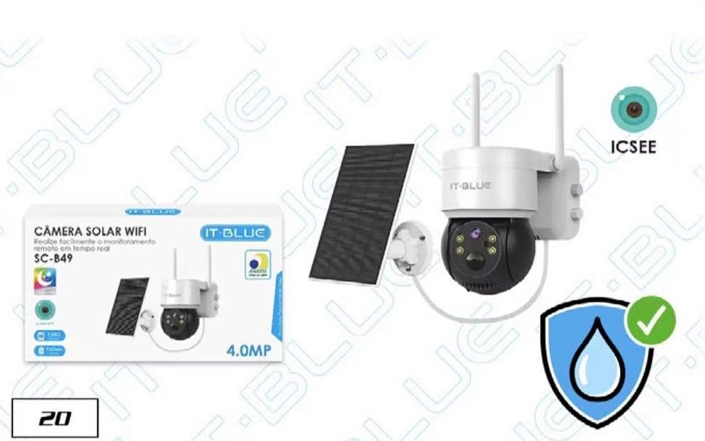 CÂMERA SOLAR WI-FI Monitoramento horizontal: 360° - Monitoramento vertical: 90° Detecção de forma humana e visão noturna Comunicação bidirecional - Microfone à prova d'água - 4.0MP - Cartão de memória: até 128Gb - Captação de energia: 7200Ah SCB49