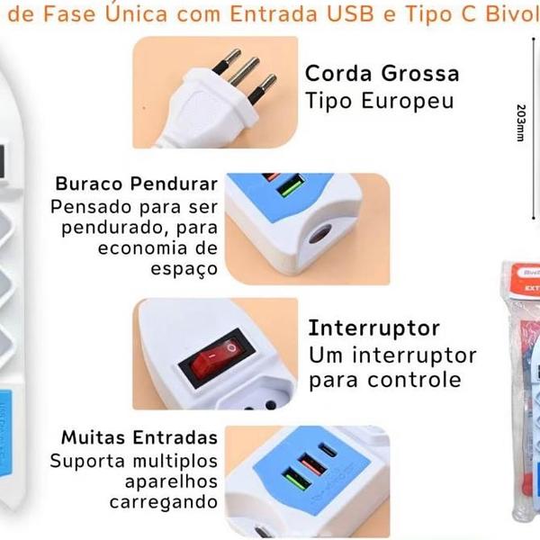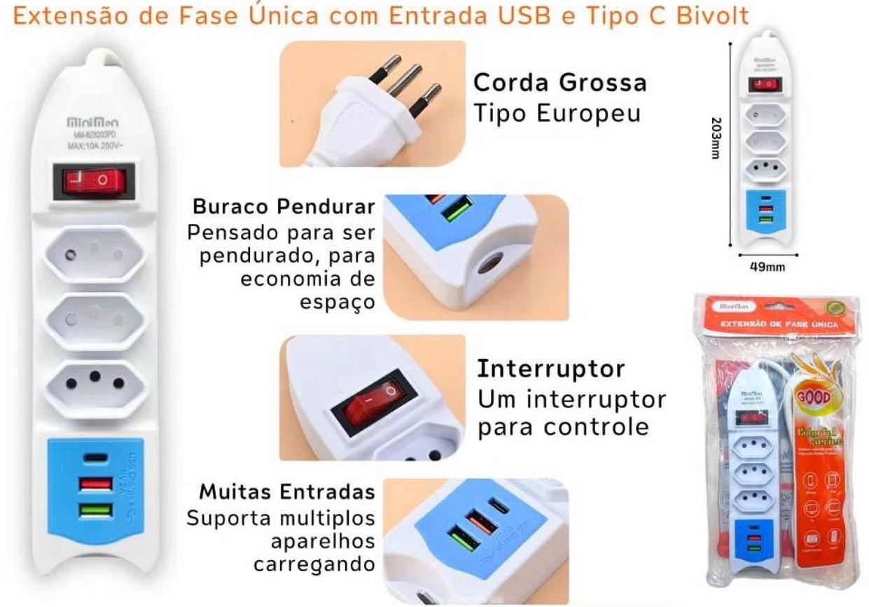 Extensão de Fase Única com Entrada USB e Tipo C Bivolt MMBZ8203PD