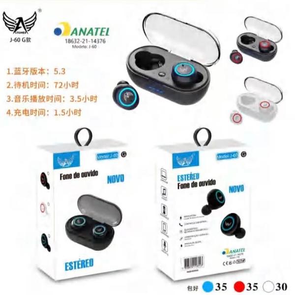 Fone de ouvido • 1. Versão Bluetooth: 5.3 • 2. Tempo de carregamento: 3.5 horas • 3. Tempo de reprodução: 1.5 horas J60 G
